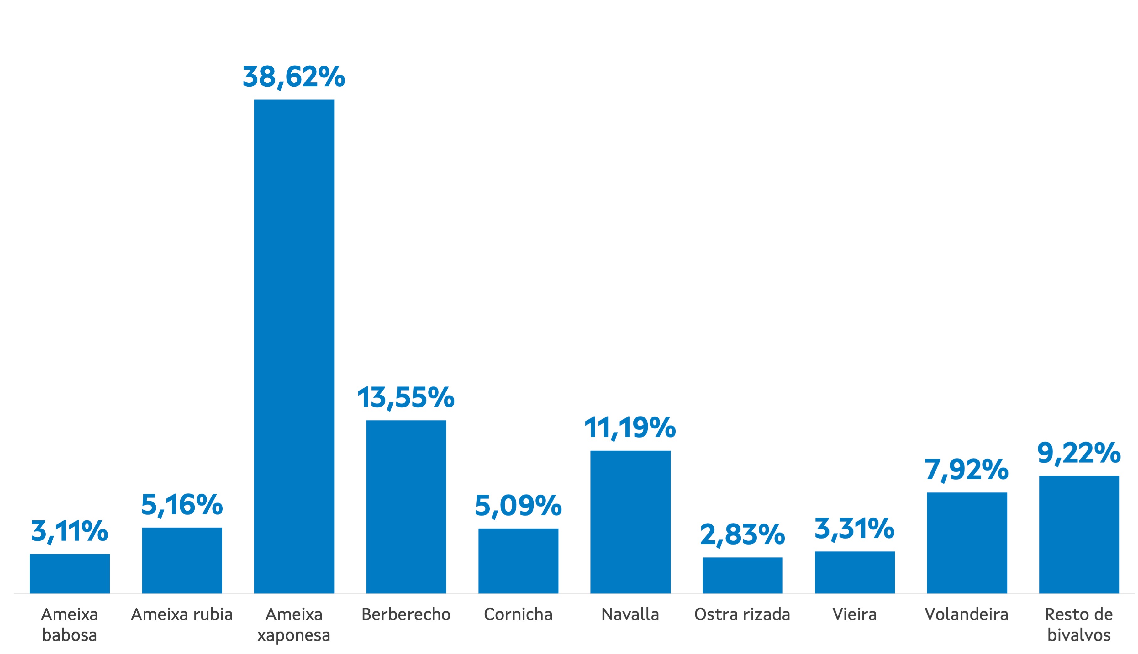 | Zamburiña | 3.587 | 0,10% | 78.202 | 0,16% | 21,80 |