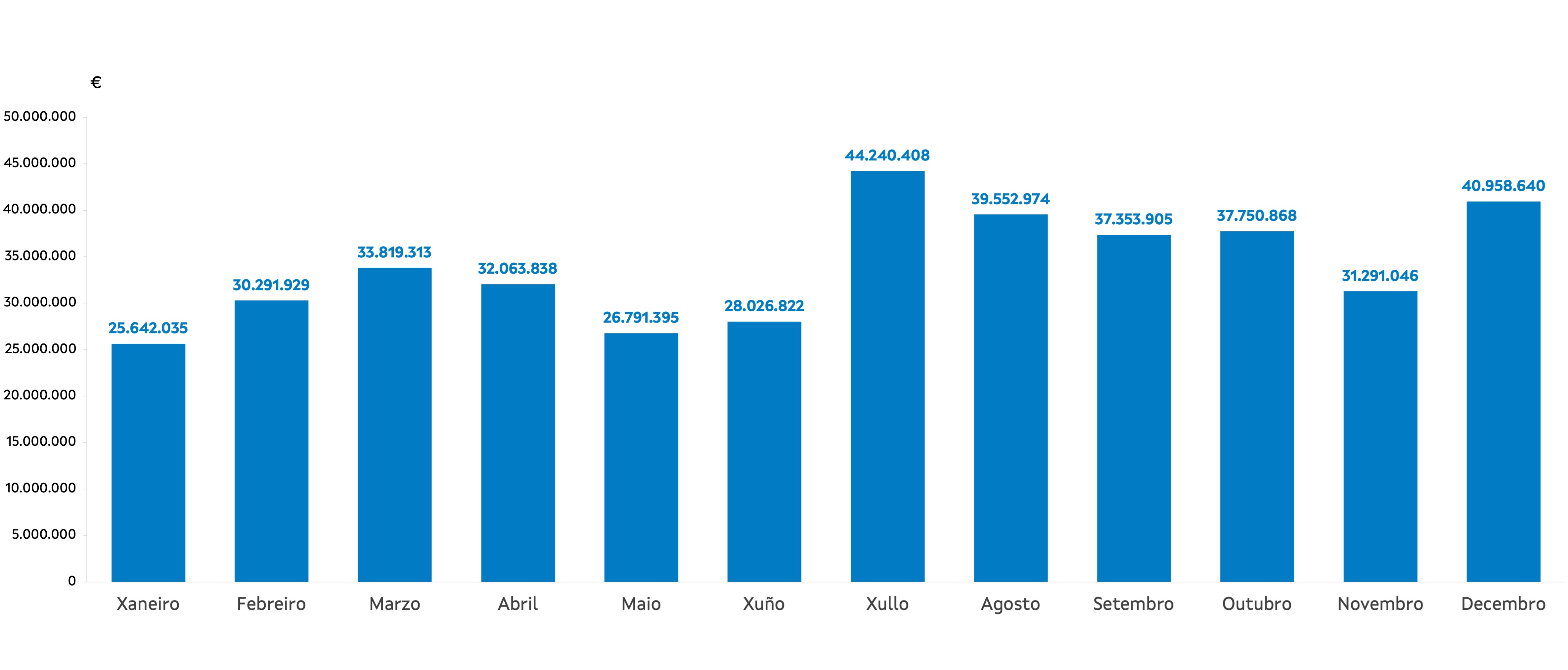 | Xaneiro | Febreiro | Marzo | Abril | Maio | Xuño | Xullo | Agosto | Setembro | Outubro | Novembro | Decembro | Total | |