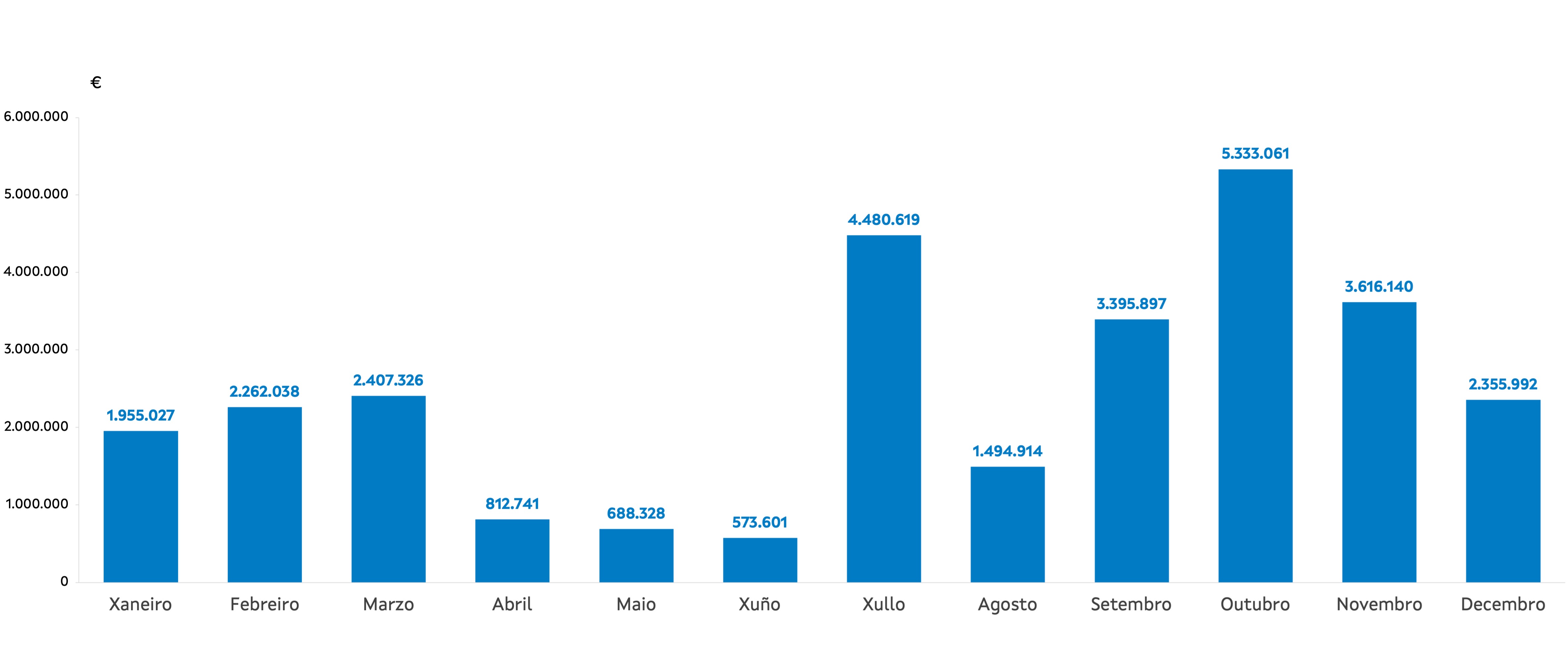 | Xaneiro | Febreiro | Marzo | Abril | Maio | Xuño | Xullo | Agosto | Setembro | Outubro | Novembro | Decembro | Total | |