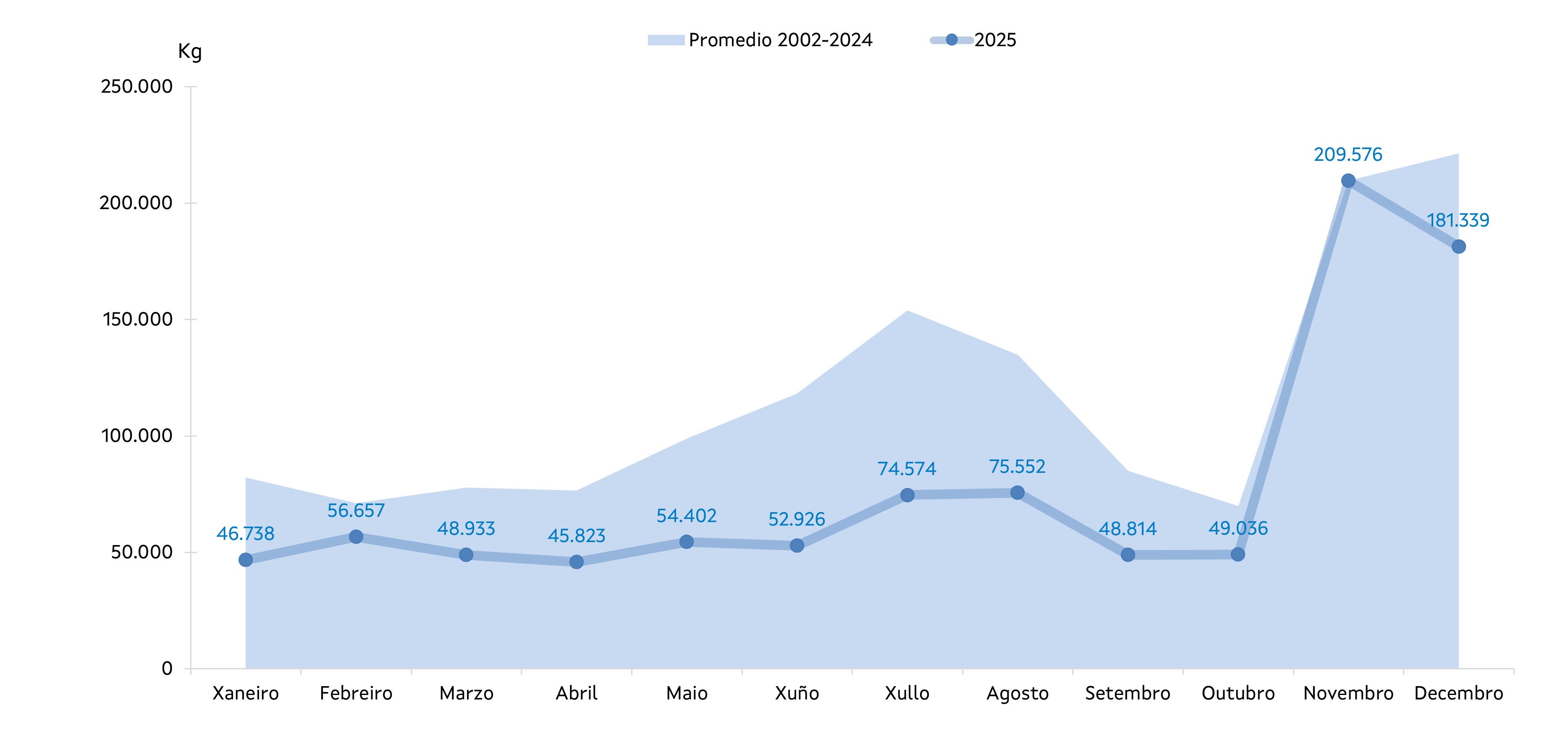 | Comparativa mensual de crustáceos no 2025 e 2024 | ||||||||