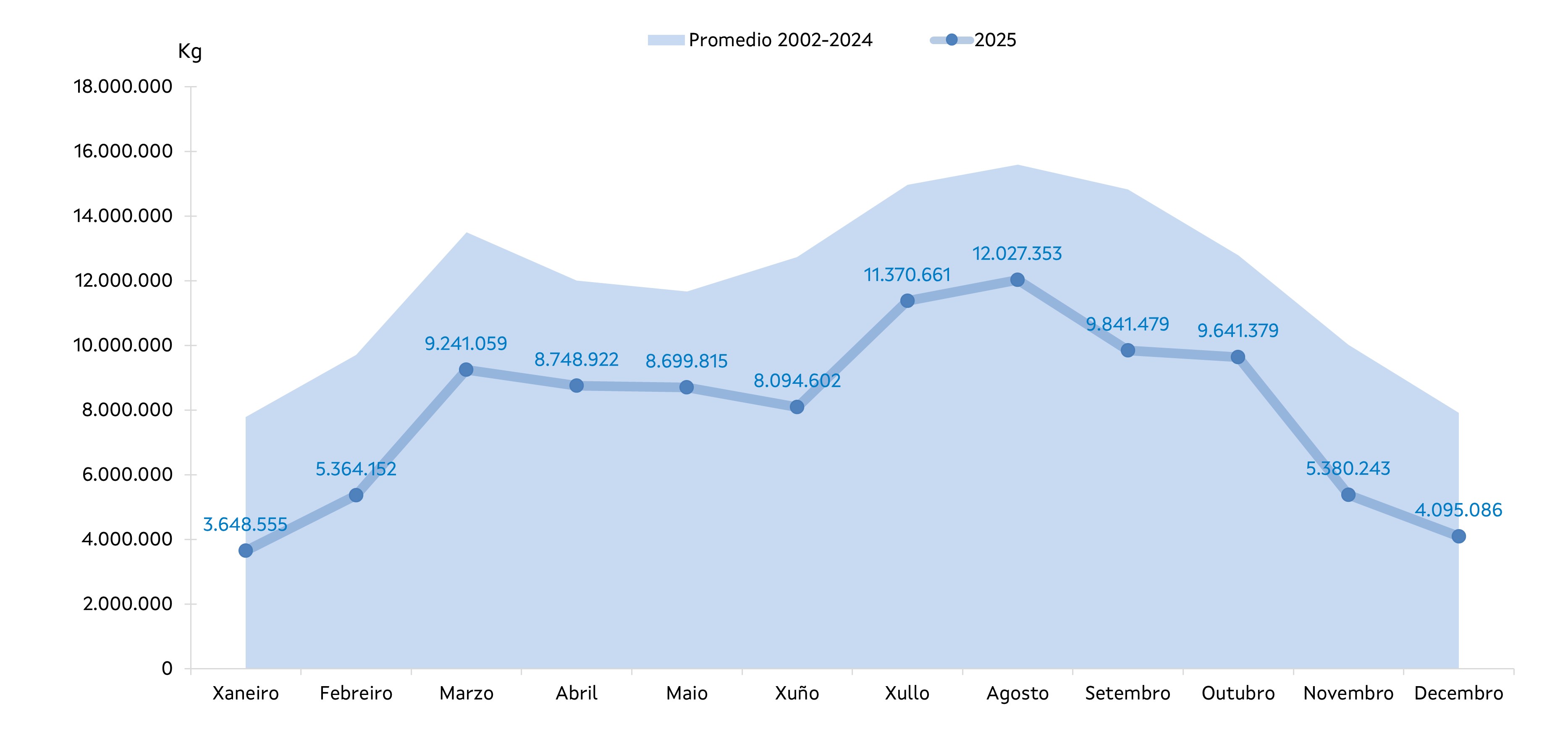 | Comparativa mensual de peixes no 2025 e 2024 | ||||||||