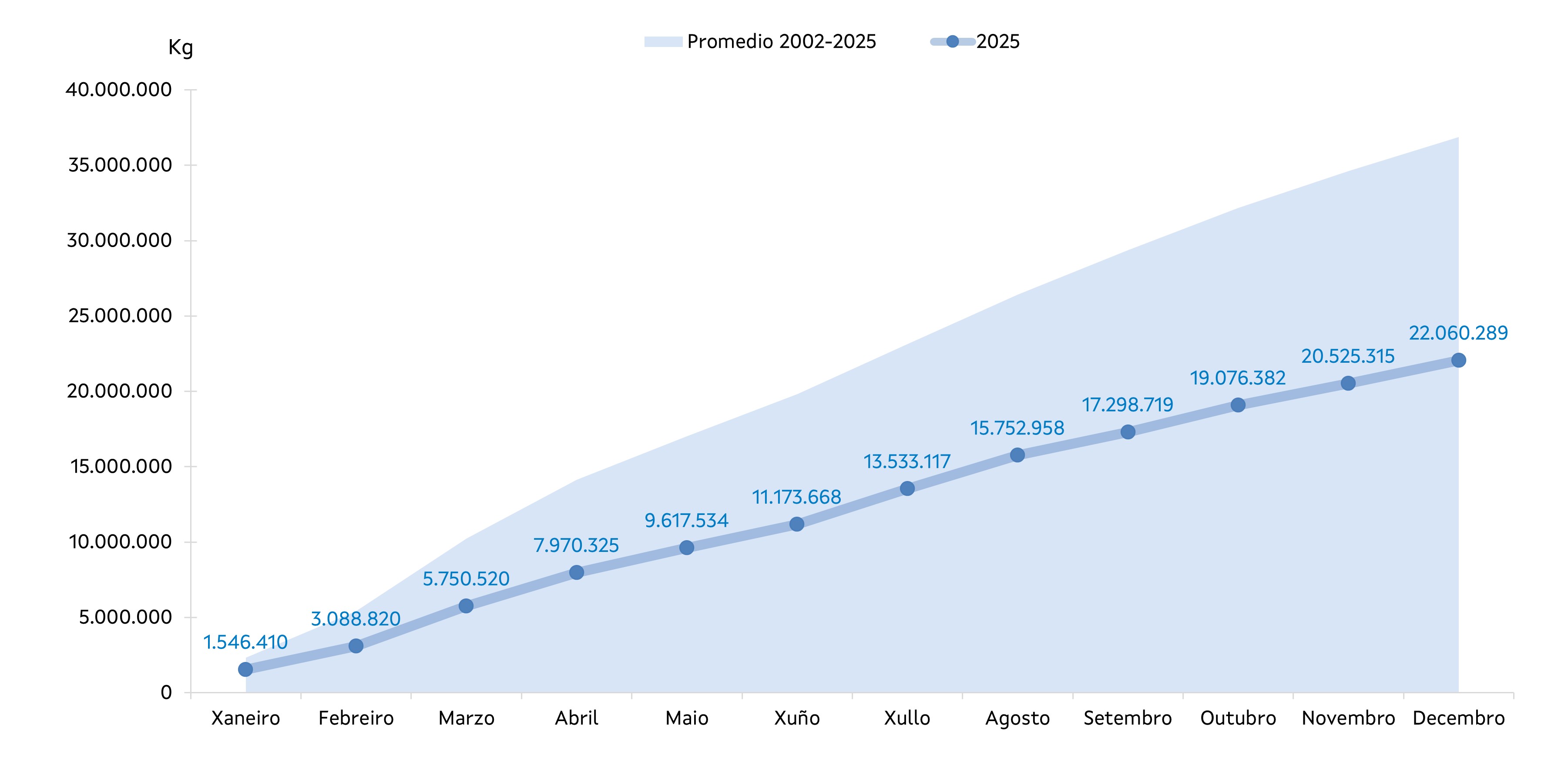 | Comparativa de lonxas na zona IX - Mariña no 2025 e 2024 | ||||||||