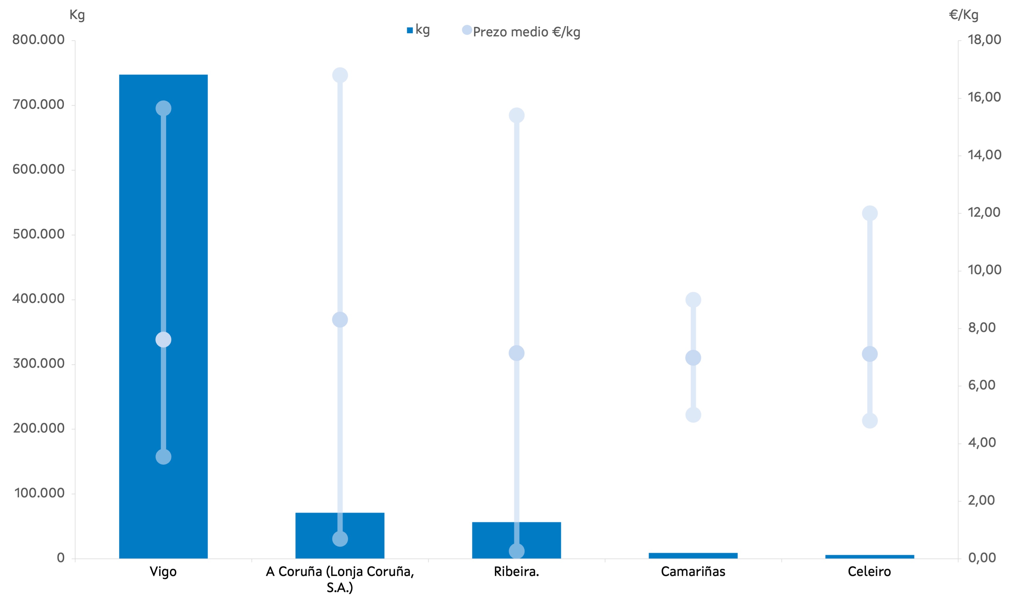 | A Coruña (Lonja Coruña, S.A.) | 172 | 71.180 | 7,94% | 591.824 | 8,66% | 8,31 |