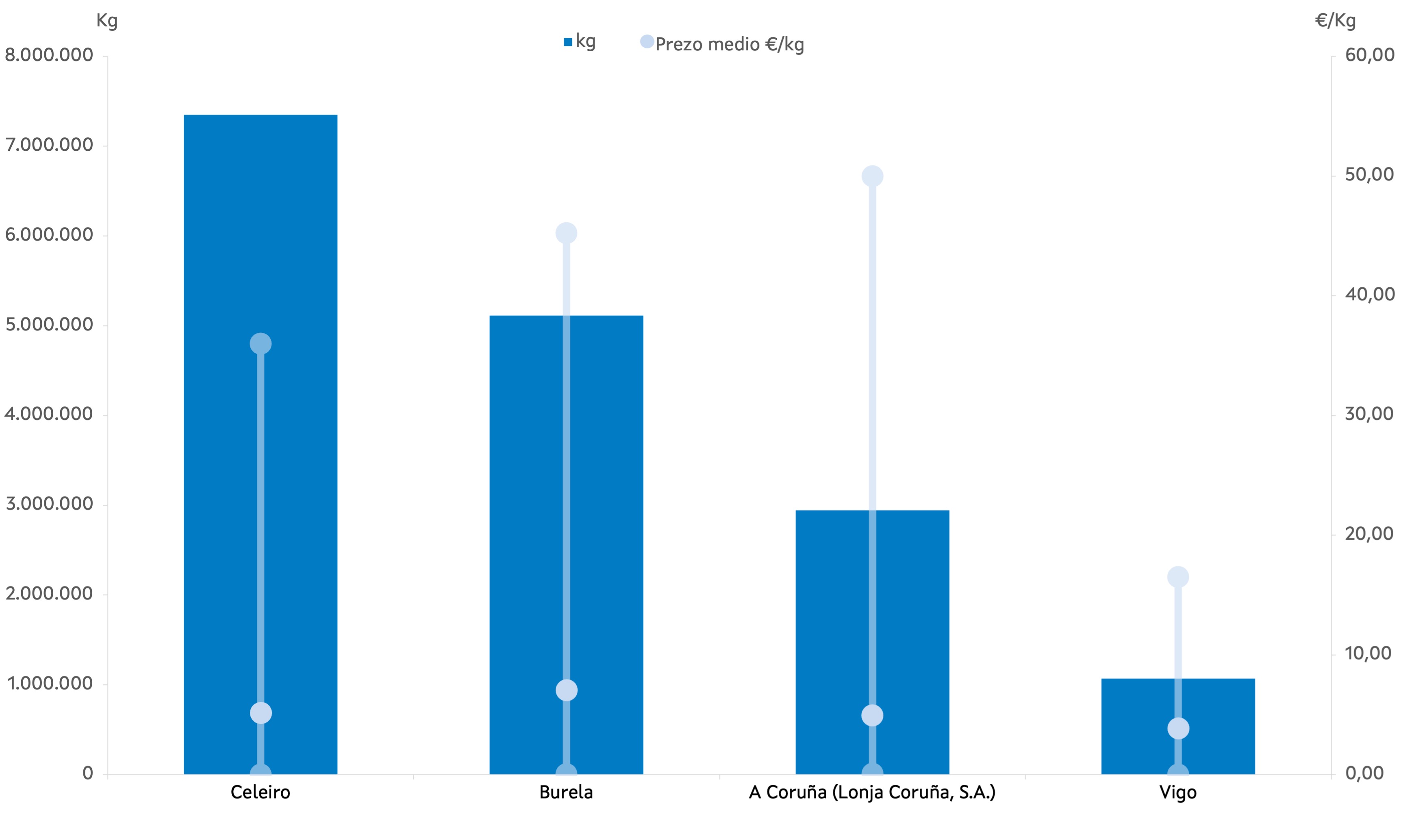| A Coruña (Lonja Coruña, S.A.) | 286 | 2.945.936 | 16,61% | 14.542.638 | 14,69% | 4,94 |