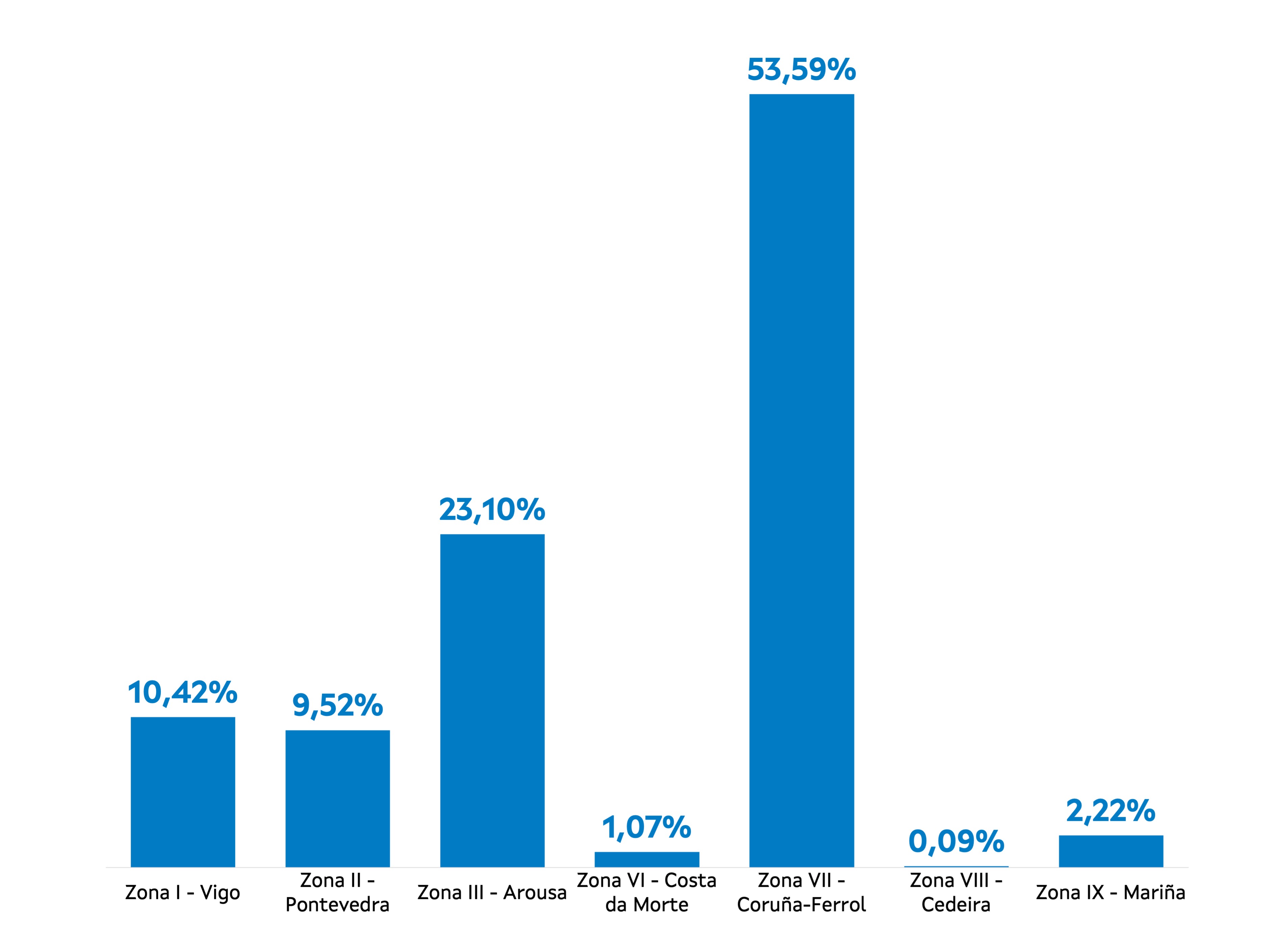 | Zona VI - Costa da Morte | 53 | 31.061 | 1,07% | 88.907 | 1,21% | 2,86 |