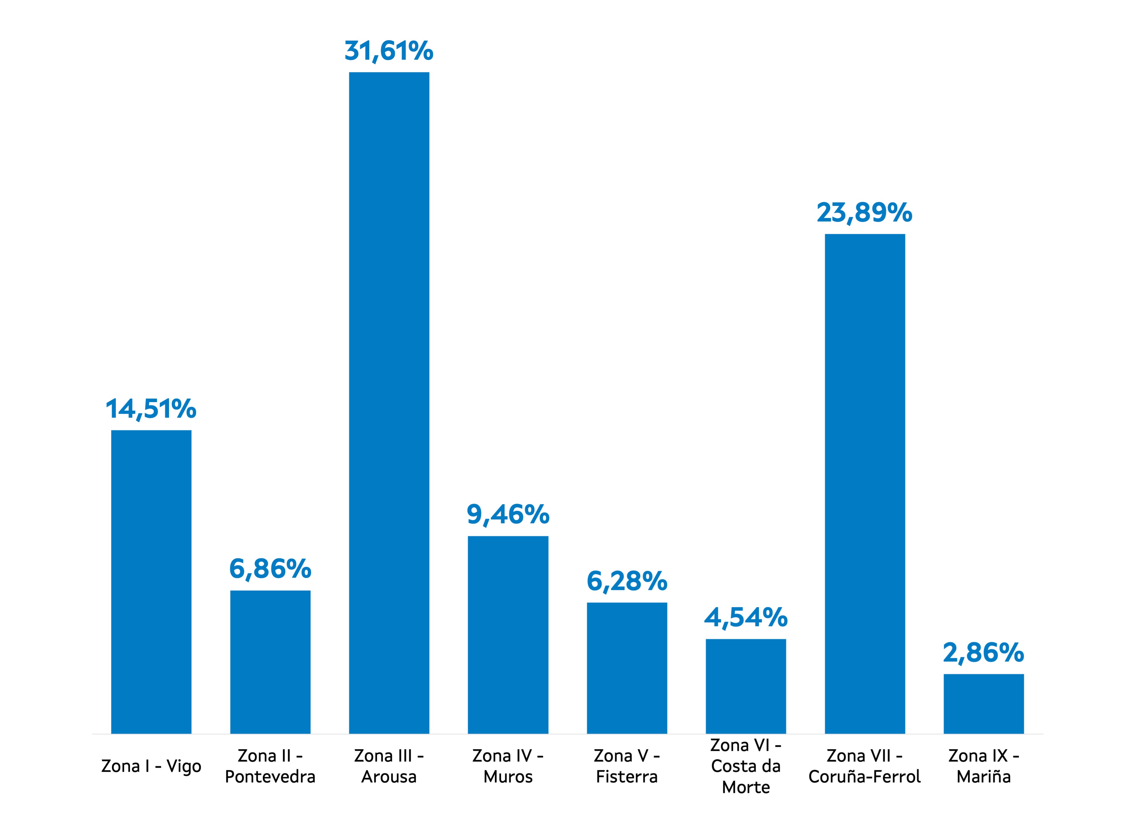 | Zona IX - Mariña | 73 | 417.820 | 2,86% | 560.703 | 2,57% | 1,34 |