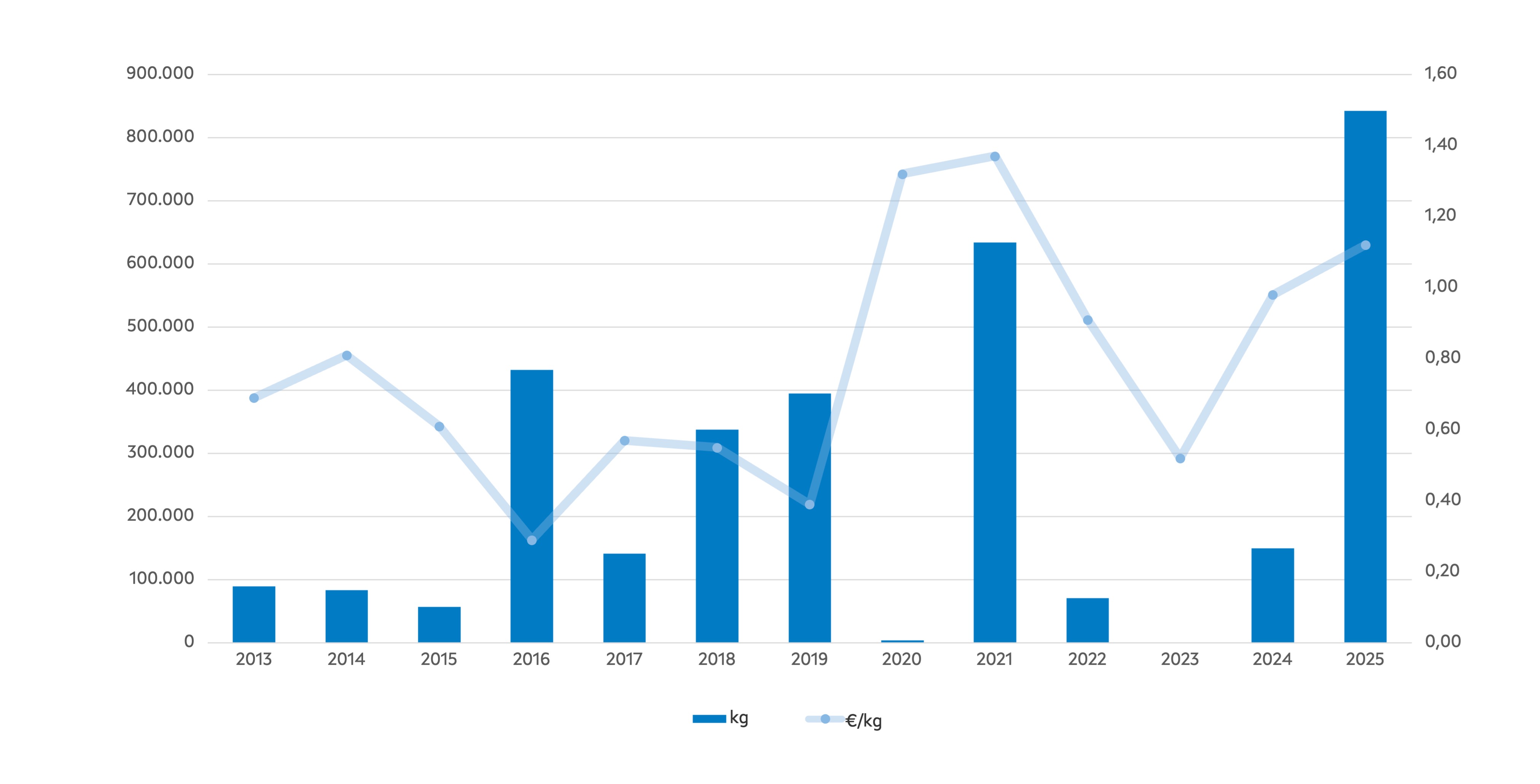 | Evolución das vendas de alcrique por zona en cantidade (kg) | |||||||||||||