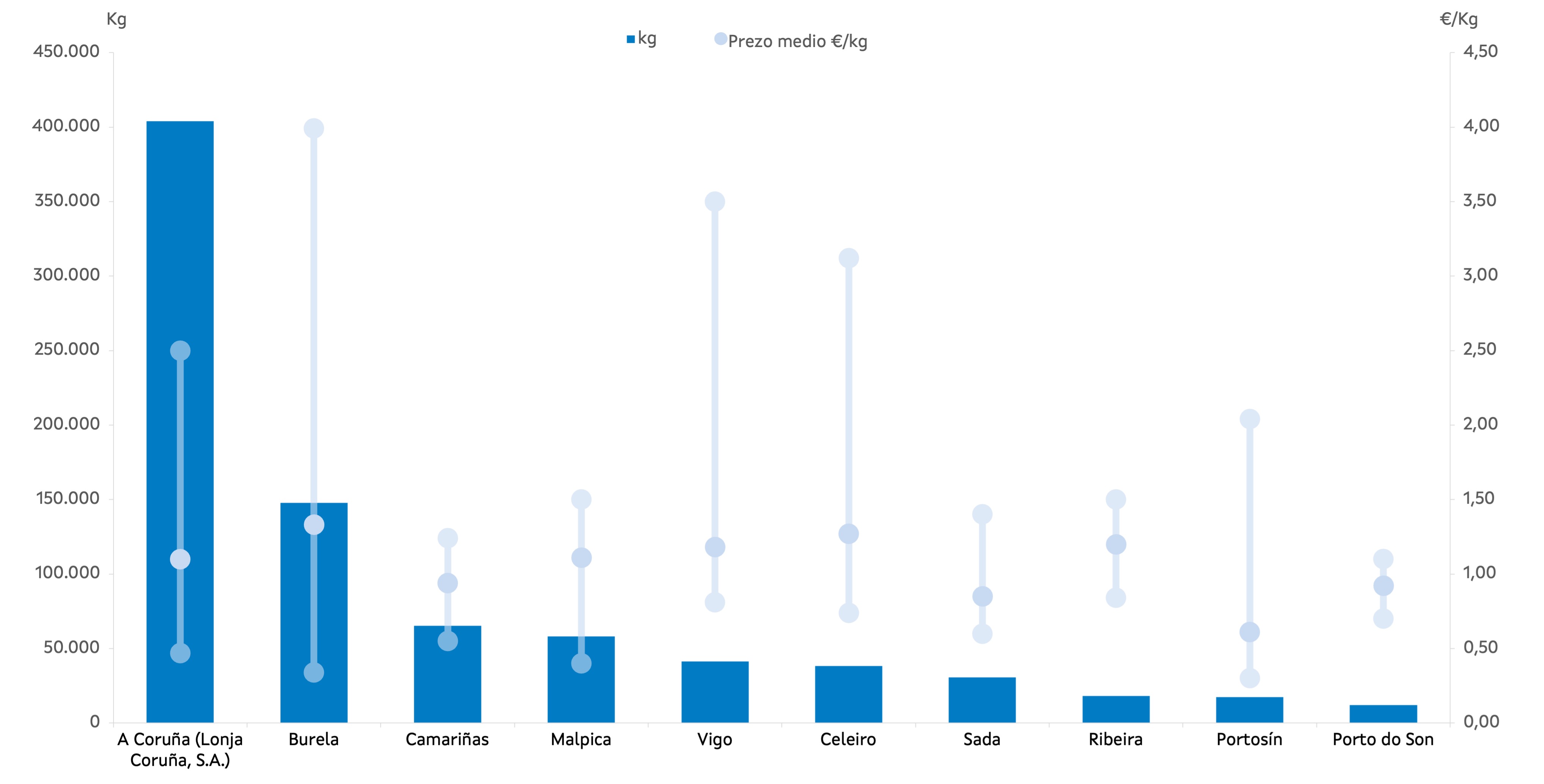 | A Coruña (Lonja Coruña, S.A.) | 4 | 403.844 | 47,94% | 443.684 | 47,00% | 1,10 |