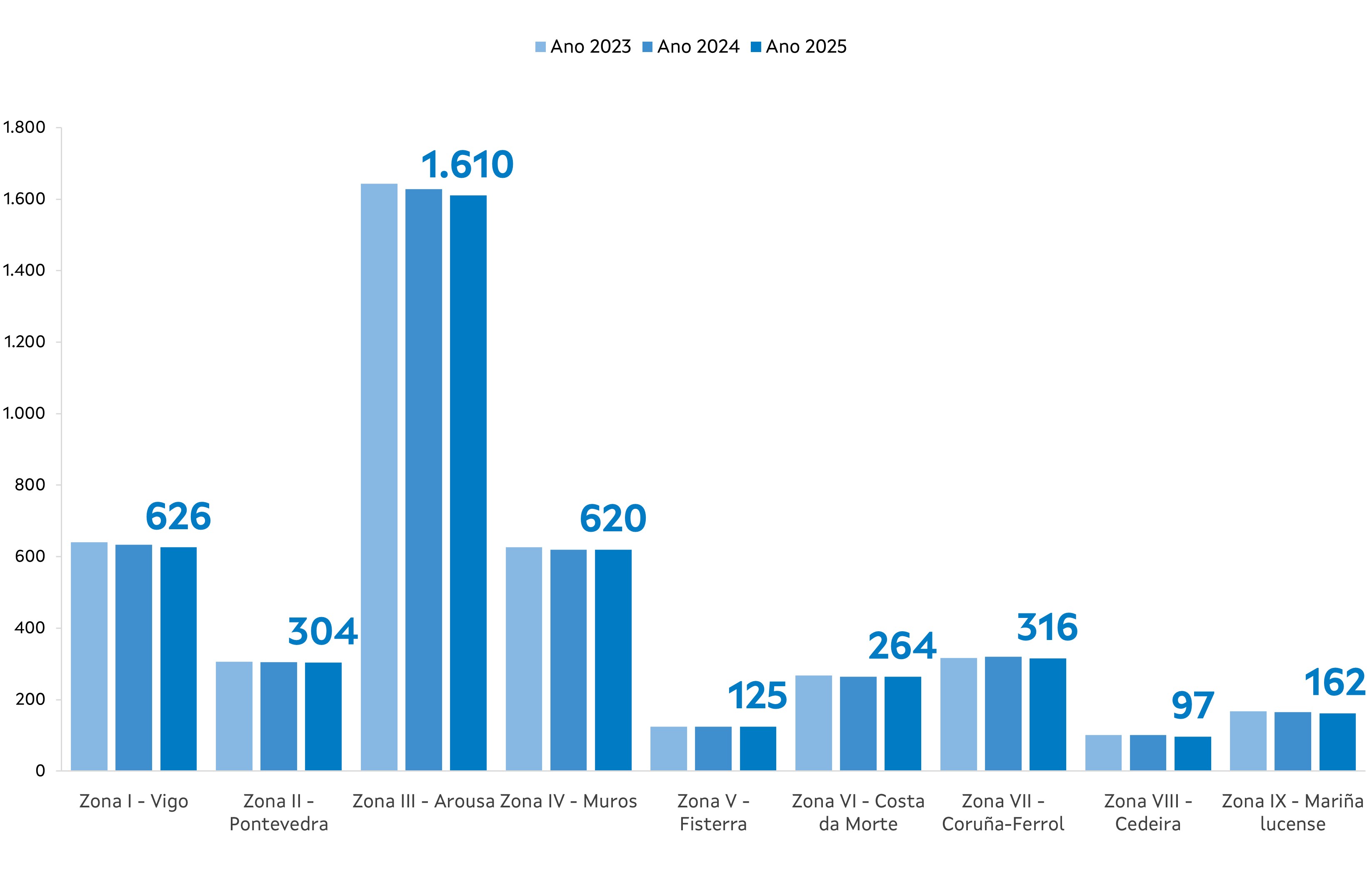 | Zona II - Pontevedra | 304 | -1 | 9,16 | -0,02 | 38,15 | 0,06 | 93,58 | -0,78 |