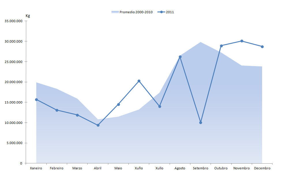 | Xuño | Cantidade (kg) | 15.081.253 | 7.518.255 | 13.548.476 | 9.159.822 | 8.614.770 | 11.993.980 | 11.569.686 | 20.284.746 | |