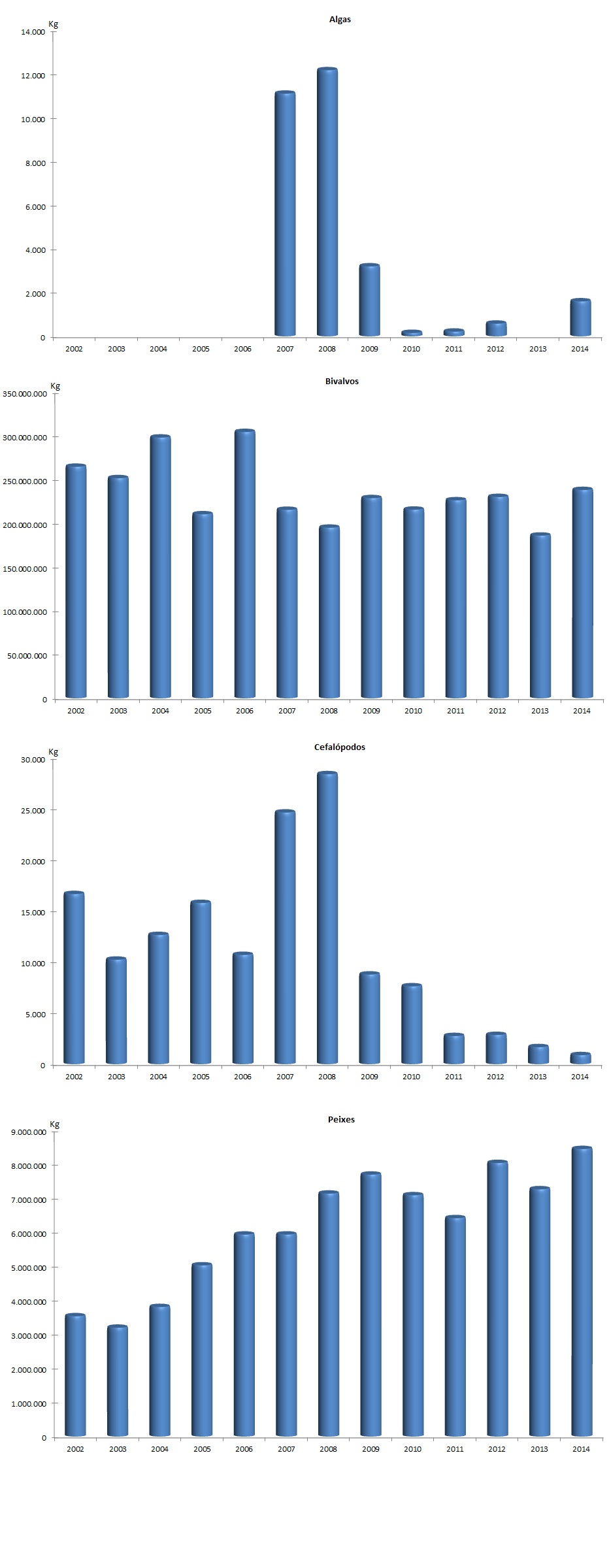 | Cefalópodos | 881 | 5.625 | 1.665 | 7.459 | -783 | -1.834 | -47,05% | -24,58% |