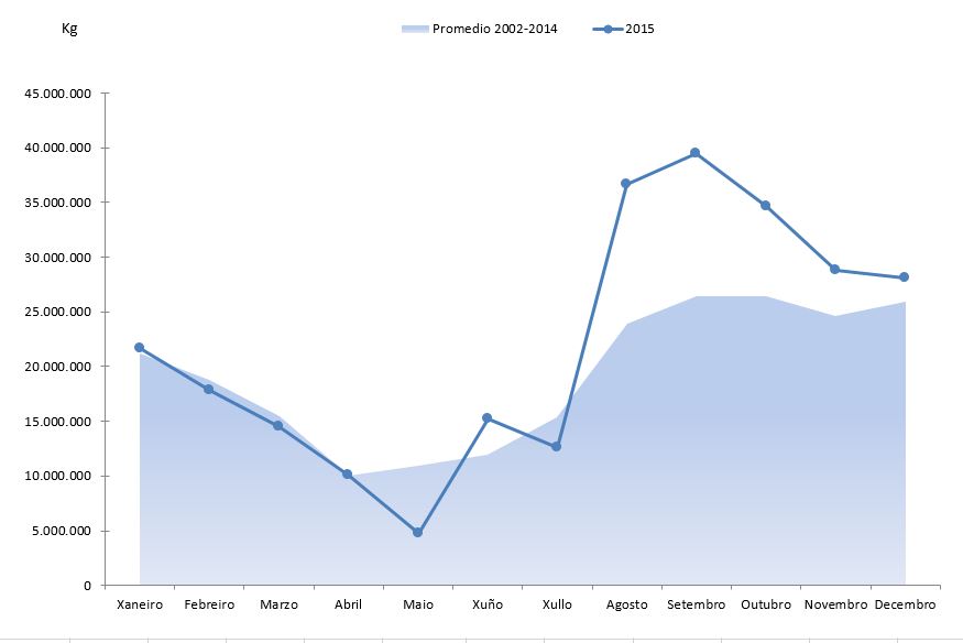 | Xuño | Cantidade (kg) | 8.614.770 | 11.993.980 | 11.569.686 | 20.284.746 | 9.097.625 | 9.598.272 | 10.112.803 | 15.179.723 | |