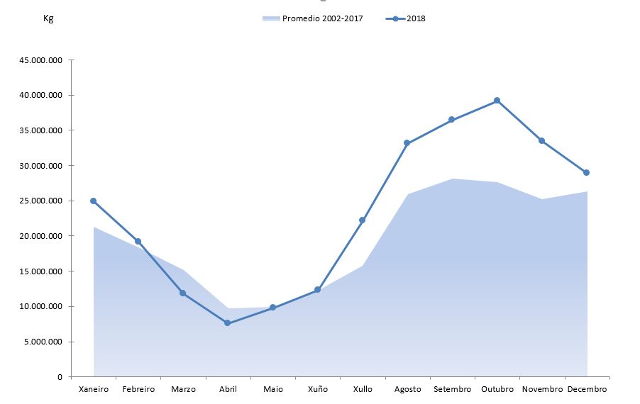 | Xuño | Cantidade (kg) | 20.284.746 | 9.097.625 | 9.598.272 | 10.112.803 | 15.179.723 | 10.477.214 | 14.766.896 | 12.251.046 | |