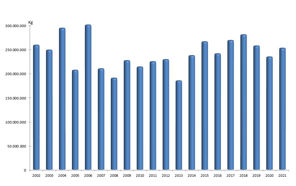 Comparativa de acuicultura do mexillón (viveiros flotantes) no 2021 e 2020
