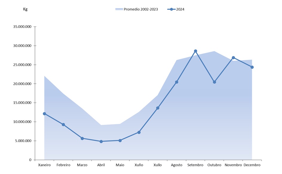 | Xuño | Cantidade (kg) | 14.766.896 | 12.251.046 | 13.213.032 | 21.072.267 | 14.709.992 | 12.186.141 | 8.189.192 | 7.264.066 | |