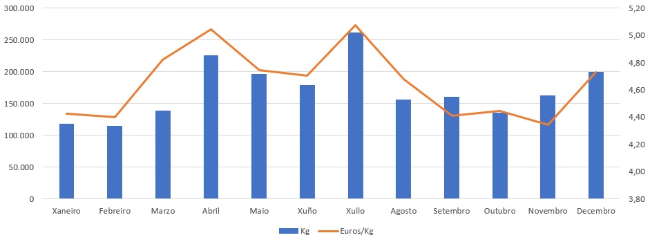 | Mes | Nº establecementos | Kg | % | Euros | % | Euros/Kg |