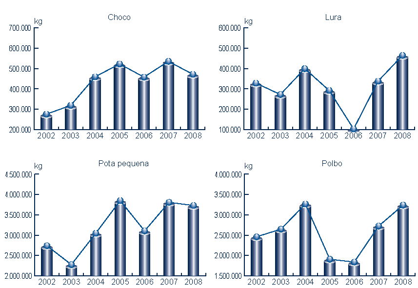 | Polbo cabezón | 1.590.290 | 1.601.421 | 2.102.080 | 2.527.955 | -511.791 | -926.534 | -24,35% | -36,65% |