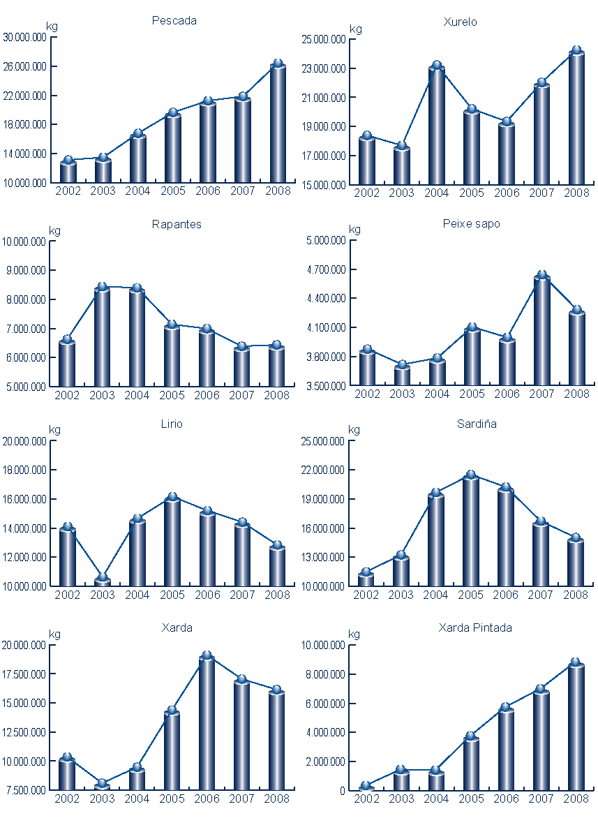 | Xurelo do mediterráneo | 72.512 | 140.209 | 27.882 | 37.349 | 44.629 | 102.860 | 160,06% | 275,40% |