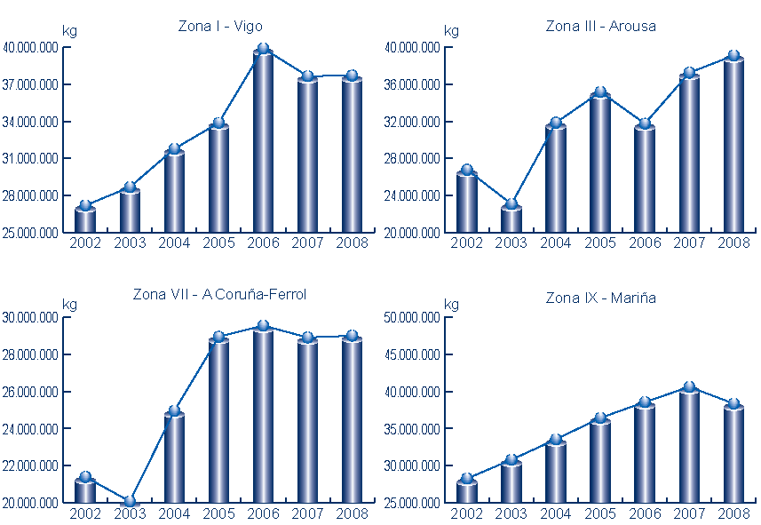 | Zona VIII - Cedeira | 2.436.645 | 9.267.231 | 2.167.814 | 9.452.179 | 268.832 | -184.948 | 12,40% | -1,96% |