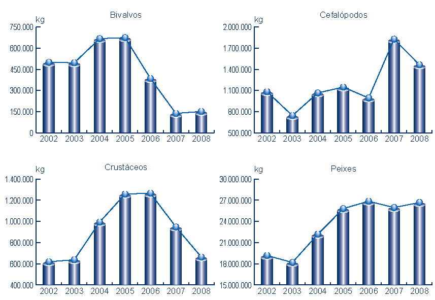 | Cefalópodos | 1.463.026 | 3.433.911 | 1.826.699 | 4.036.177 | -363.673 | -602.265 | -19,91% | -14,92% |