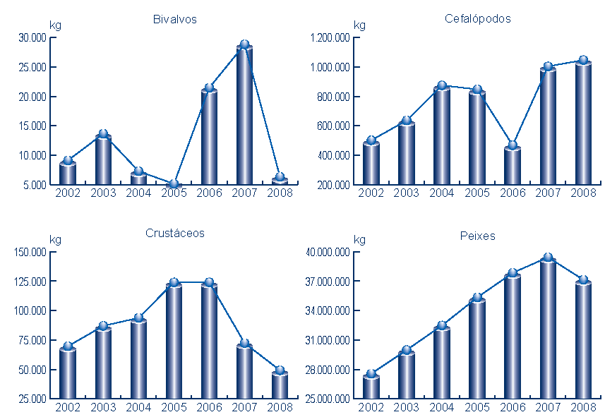 | Cefalópodos | 1.046.484 | 2.387.145 | 1.003.222 | 2.708.341 | 43.262 | -321.196 | 4,31% | -11,86% |