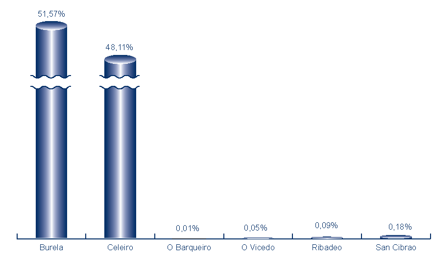 | O Vicedo | 19.036 | 0,05% | 86.930 | 0,10% | 4,57 |