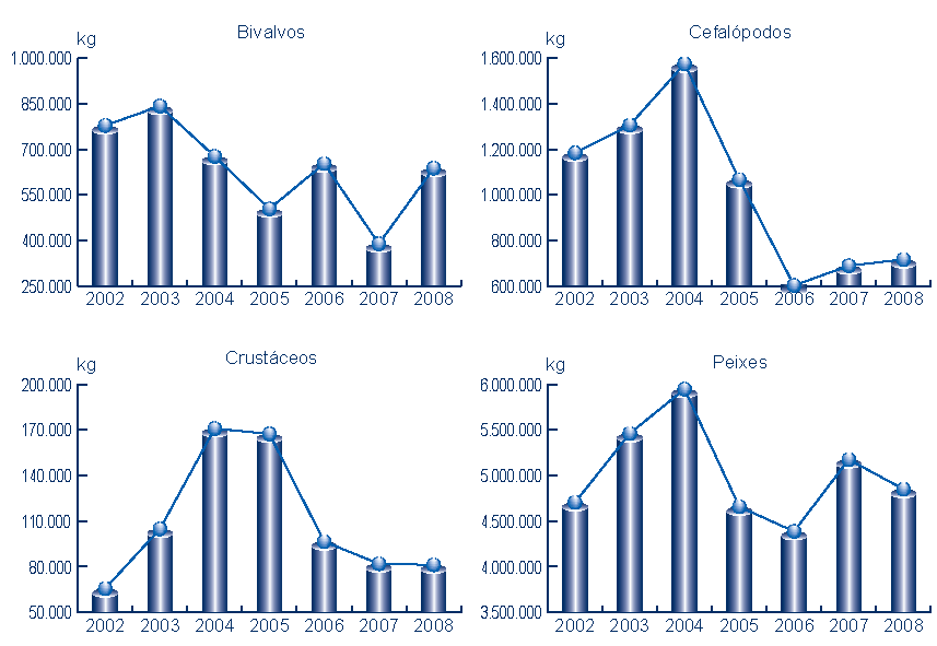 | Cefalópodos | 716.445 | 2.879.938 | 688.947 | 2.171.638 | 27.498 | 708.300 | 3,99% | 32,62% |