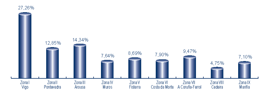 | Zona I - Vigo | 291 | 883.204 | 27,26% | 3.725.276 | 23,54% | 4,22 |