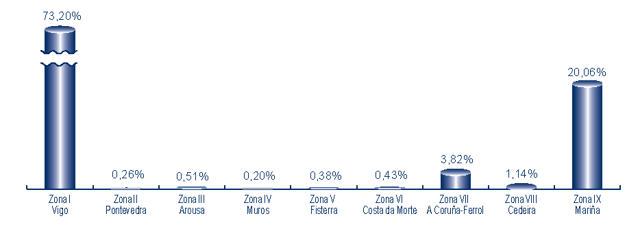 | Zona VI - Costa da Morte | 235 | 6.609 | 0,43% | 84.691 | 1,09% | 12,82 |