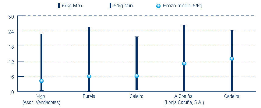 | A Coruña (Lonja Coruña, S.A.) | 255 | 59.088 | 3,81% | 650.941 | 8,40% | 11,02 |
