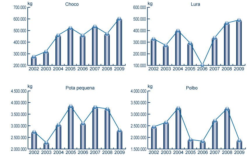 | Polbo cabezón | 1.325.863 | 1.187.964 | 1.590.290 | 1.601.421 | -264.427 | -413.457 | -16,63% | -25,82% |