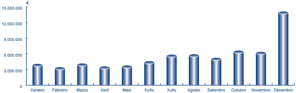 | Xaneiro | Febreiro | Marzo | Abril | Maio | Xuño | Xullo | Agosto | Setembro | Outubro | Novembro | Decembro | Total | |