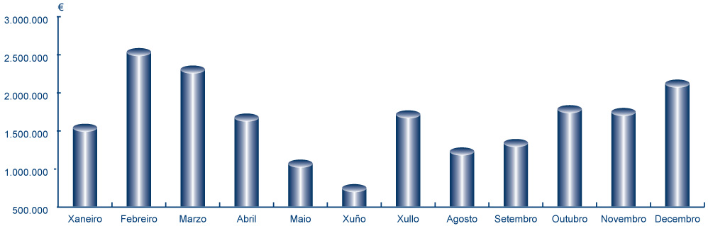 | Xaneiro | Febreiro | Marzo | Abril | Maio | Xuño | Xullo | Agosto | Setembro | Outubro | Novembro | Decembro | Total | |