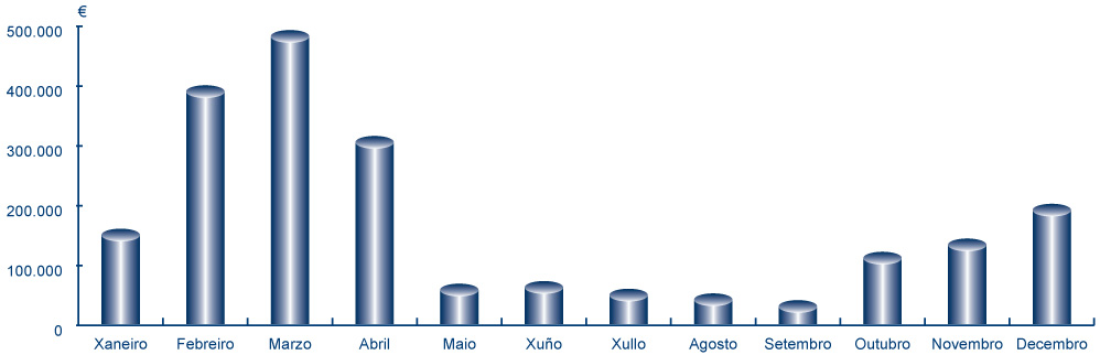 | Xaneiro | Febreiro | Marzo | Abril | Maio | Xuño | Xullo | Agosto | Setembro | Outubro | Novembro | Decembro | Total | |