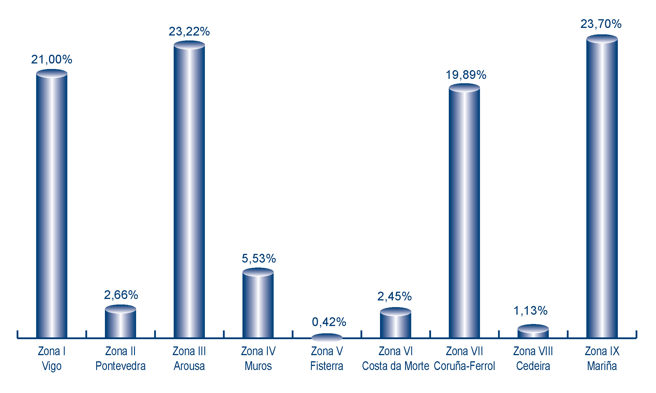 | Zona V - Fisterra | 820.472 | 0,42% | 3.338.346 | 0,79% | 4,07 |