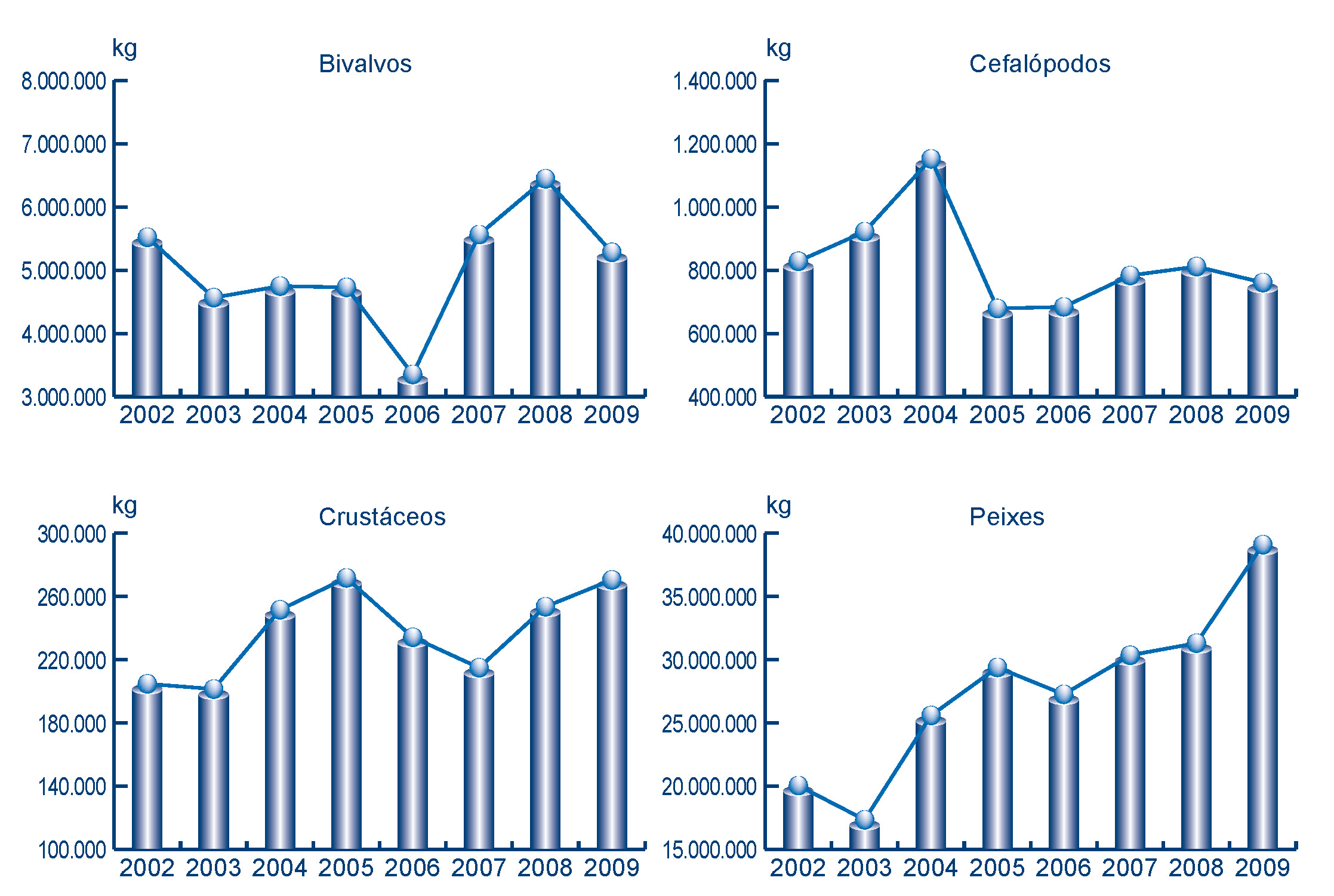| Cefalópodos | 760.907 | 3.823.281 | 811.614 | 4.191.926 | -50.707 | -368.644 | -6,25% | -8,79% |