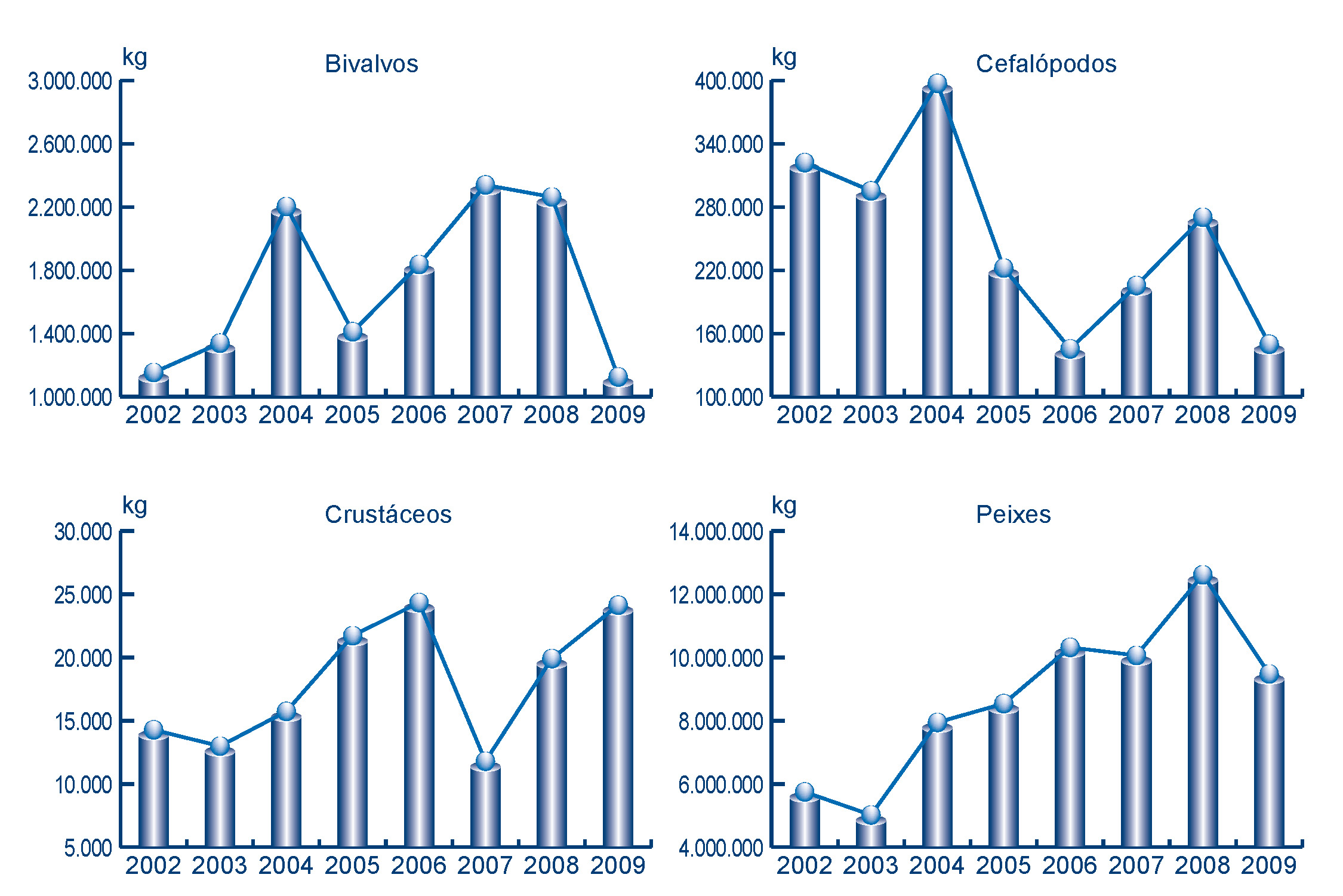 | Cefalópodos | 149.789 | 726.856 | 270.246 | 1.368.277 | -120.457 | -641.422 | -44,57% | -46,88% |