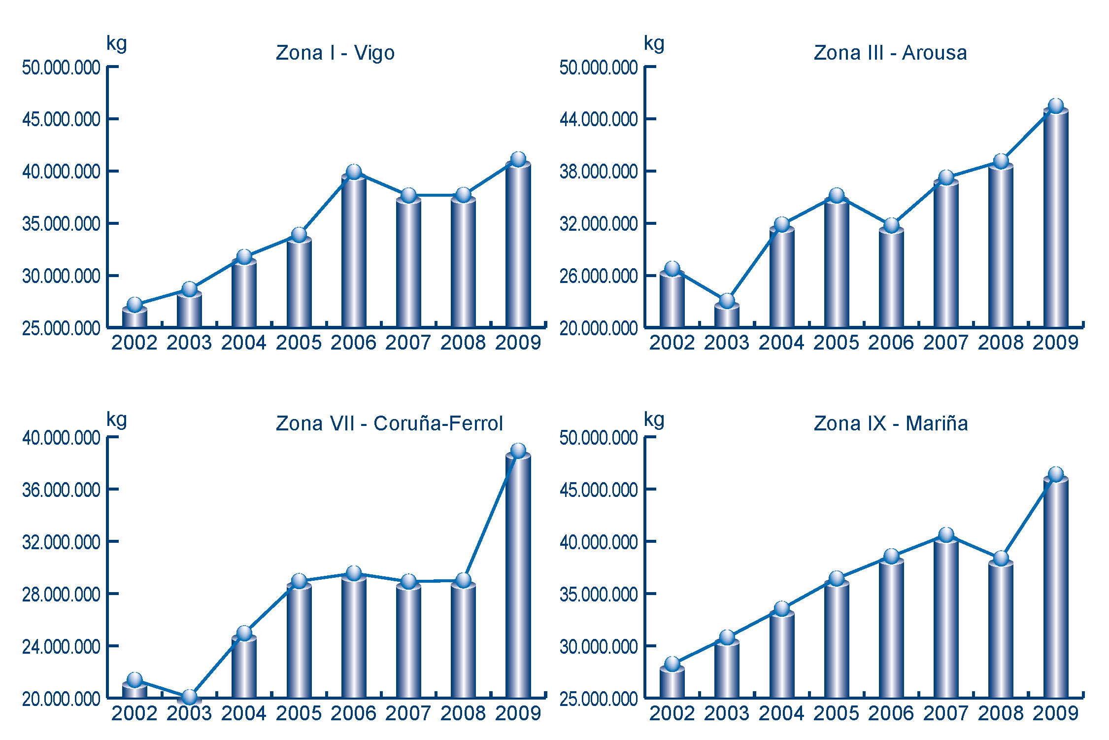 | Zona VIII - Cedeira | 2.208.021 | 7.442.778 | 2.436.645 | 9.267.231 | -228.624 | -1.824.453 | -9,38% | -19,69% |