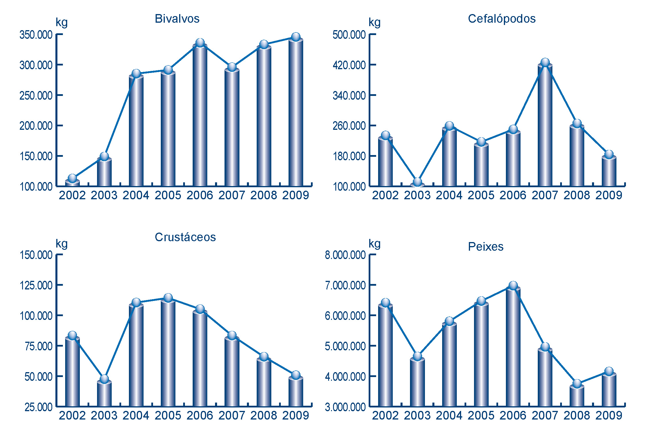 | Bivalvos | 345.380 | 1.914.041 | 333.088 | 2.091.864 | 12.291 | -177.823 | 3,69% | -8,50% |