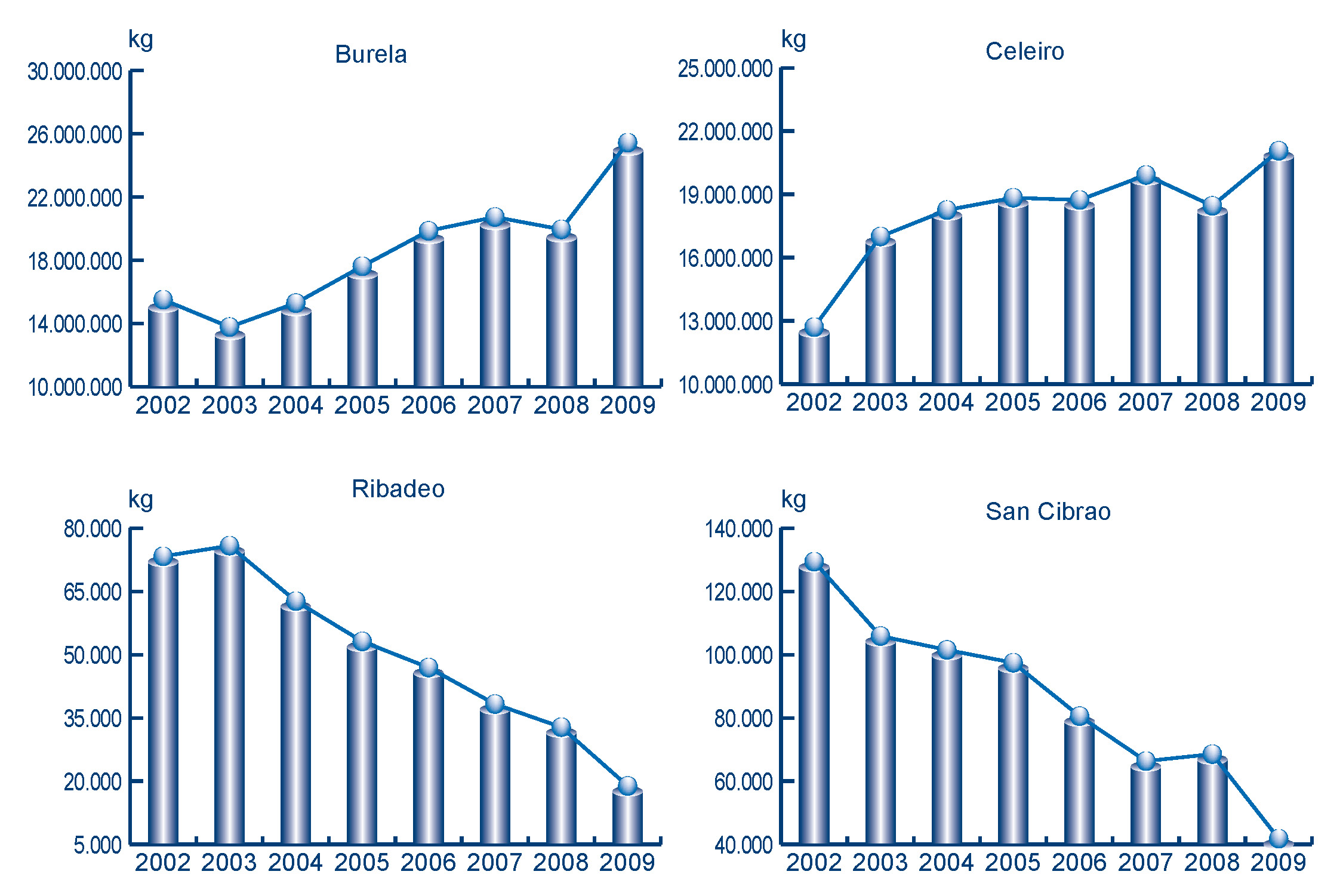 | San Cibrao | 41.831 | 471.461 | 68.551 | 537.454 | -26.720 | -65.993 | -38,98% | -12,28% |