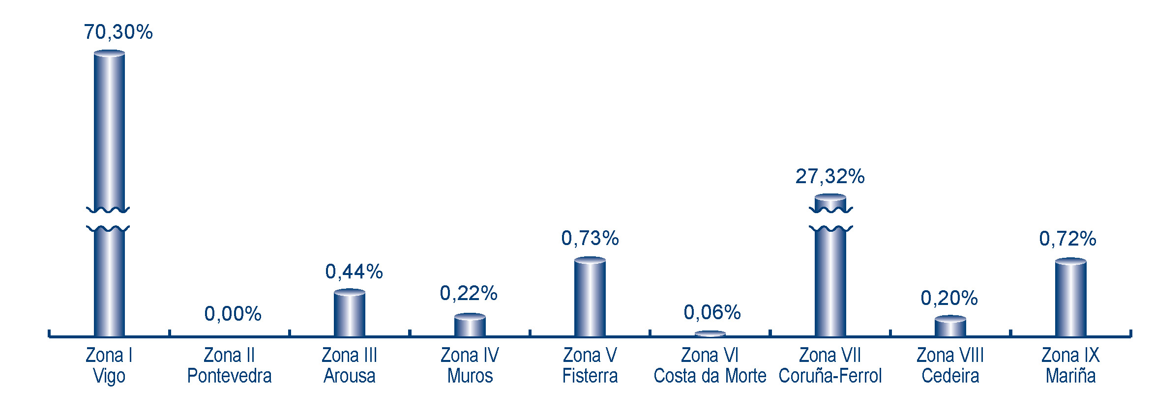 | Zona VI - Costa da Morte | 161 | 2.559 | 0,06% | 21.180 | 0,10% | 8,28 |