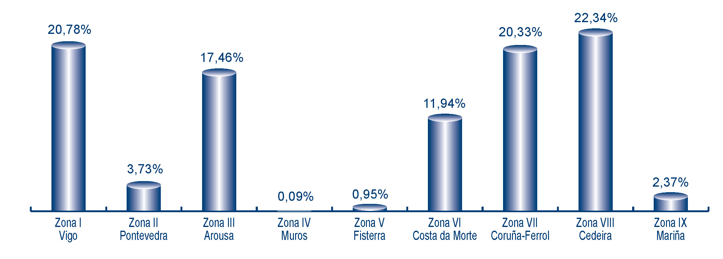| Zona VI - Costa da Morte | 191 | 36.547 | 11,94% | 894.400 | 10,40% | 24,47 |