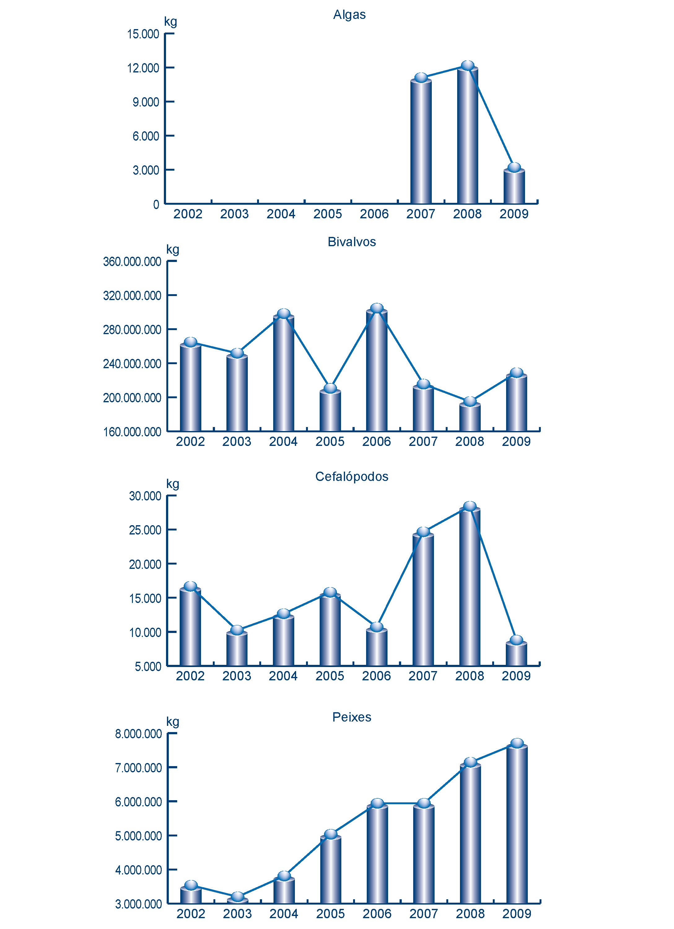 | Cefalópodos | 8.785 | 46.521 | 28.417 | 162.788 | -19.632 | -116.266 | -69,08% | -71,42% |