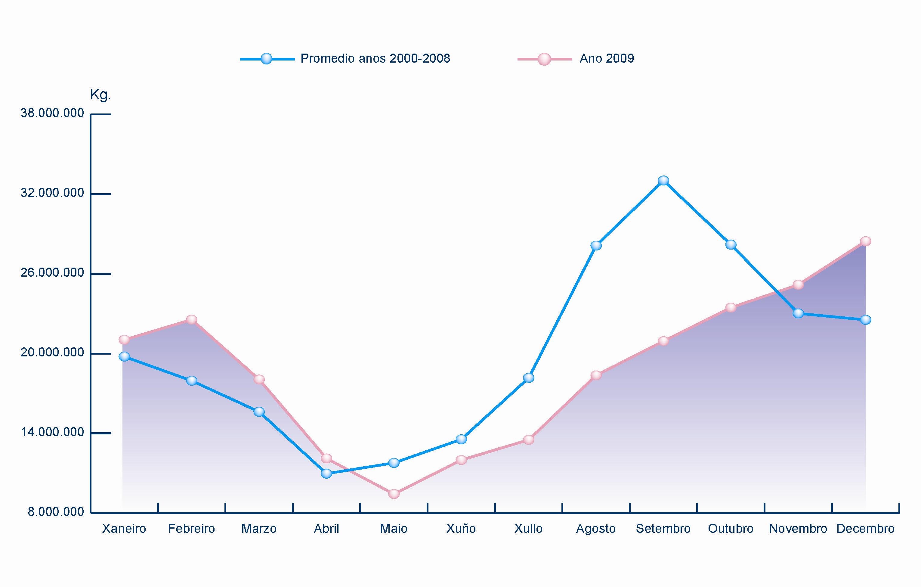 | Xuño | Cantidade (kg) | 11.956.411 | 16.319.994 | 15.081.253 | 7.518.255 | 13.548.476 | 9.159.822 | 8.614.770 | 11.993.980 | |