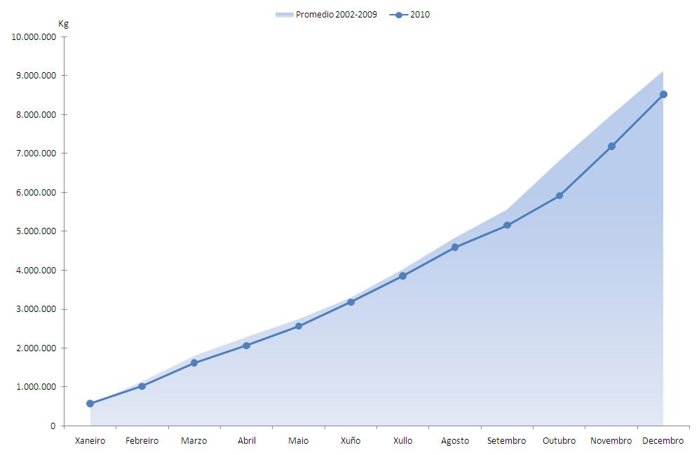 | Longueirón | 91.592 | 692.650 | 72.001 | 670.648 | 19.591 | 22.002 | 27,21% | 3,28% |