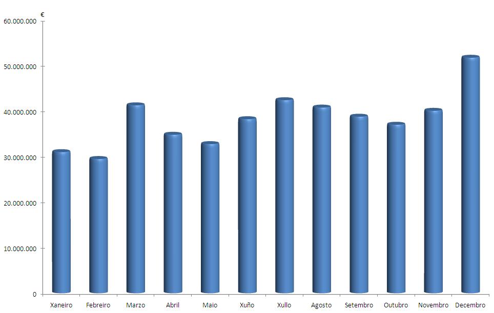 | Xaneiro | Febreiro | Marzo | Abril | Maio | Xuño | Xullo | Agosto | Setembro | Outubro | Novembro | Decembro | Total | |