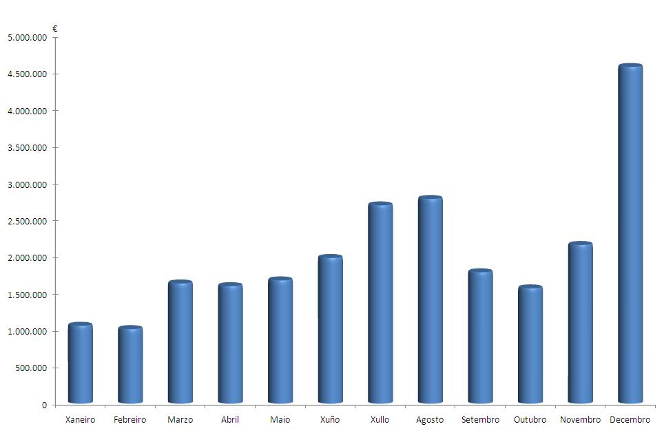 | Xaneiro | Febreiro | Marzo | Abril | Maio | Xuño | Xullo | Agosto | Setembro | Outubro | Novembro | Decembro | Total | |