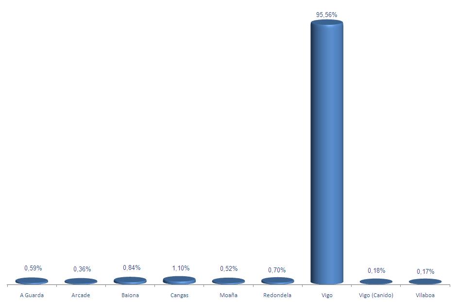 | Redondela | 285.788 | 0,70% | 2.128.032 | 1,67% | 7,45 |