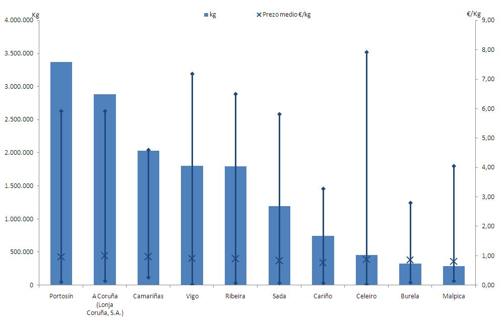 | A Coruña (Lonja Coruña, S.A.) | 190 | 2.885.398 | 18,66% | 2.944.084 | 19,88% | 1,02 |