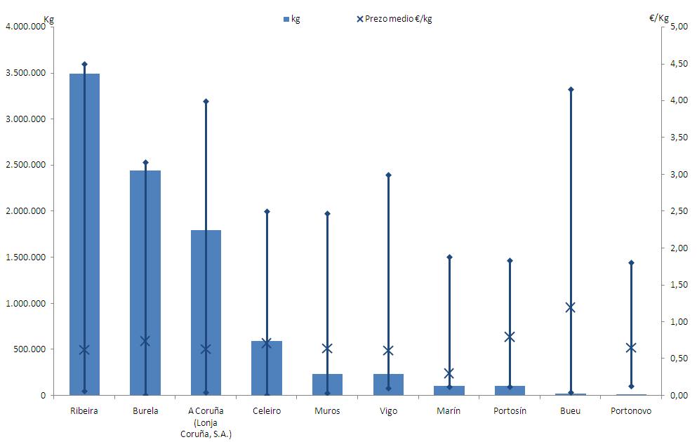 | A Coruña (Lonja Coruña, S.A.) | 125 | 1.791.592 | 19,65% | 1.132.991 | 18,73% | 0,63 |